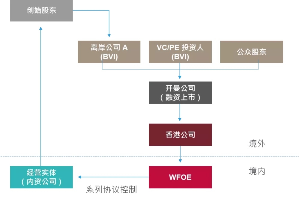 以红筹架构中最常见的VIE架构为例。VIE架构通常由境外上市主体、外商独资企业(WOFE)和境内经营实体三部分组成。